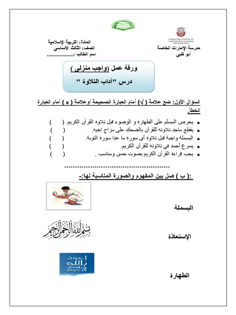ورق عمل آداب التلاوة تربية إسلامية صف ثالث فصل أول مدرستي الامارتية