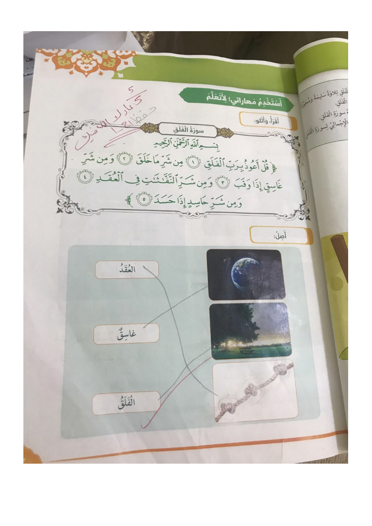 التربية الإسلامية ورقة عمل سورة الفلق للصف الأول ملفاتي