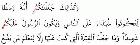 و ك ذ ل ك ج ع ل ن اك م أ م ة و س ط ا ل ت ك ون وا ش ه د اء ع ل ى الن اس و ي ك ون الر س ول ع ل ي ك م ش ه يد ا و م ا ج ع ل ن ا ال ق ب ل ة ال ت ي ك ن ت ع ل ي ه ا إ ل ا ل ن ع ل م م ن ي ت ب ع الر س ول م م ن ي ن ق ل ب ع ل ى ع ق ب ي ه